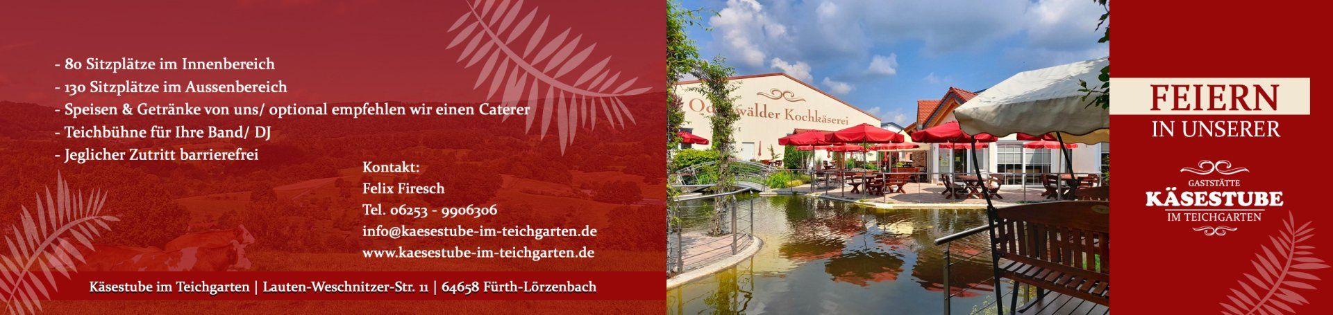 Ansprechpartner: Felix Firesch unter 06253 - 9906306 oder Mail an: info@kaesestube-im-teichgarten.de